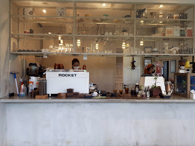 To enter the cafe, we used a side entrance. I thought the black and white gave it character. I noticed that the building is perched on a hillside and is surrounded by greenery.